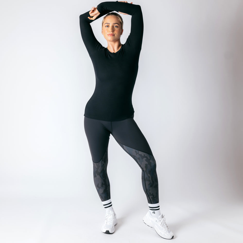 This long-sleeved workout tee is meticulously crafted from natural Bamboo fibres, a fabric renowned for its exceptional softness, breathability, and absorbency. Designed with the modern athlete in mind, this tee offers unparalleled comfort and performance for various fitness activities. The bamboo fabric feels incredibly soft against the skin, providing a luxurious and comfortable fit. It's exceptional breathability allows air to circulate, keeping you cool and dry even during intense workouts. Boasting 360-degree stretch, allowing it to adapt to your every move, whether you're performing dynamic stretches, intense cardio, or weightlifting exercises, this top moves with you, ensuring maximum comfort and freedom of movement. If you're looking for a tee that combines comfort, performance, and style, look no further, this is the perfect choice for